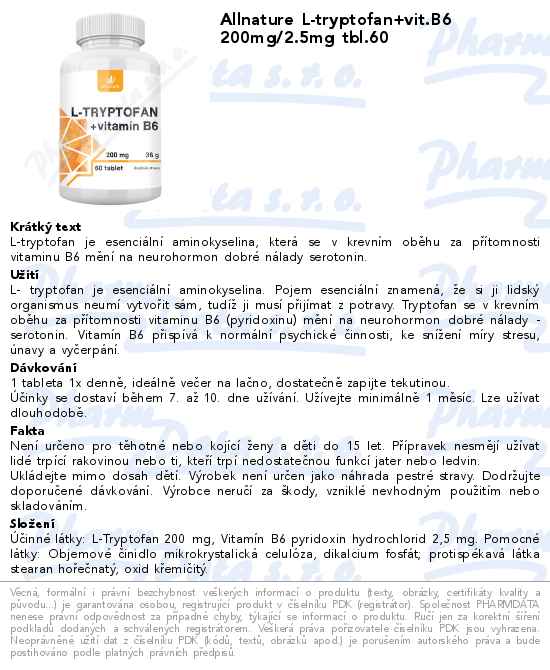 Allnature L-tryptofan+vit.B6 200mg/2.5mg tbl.60