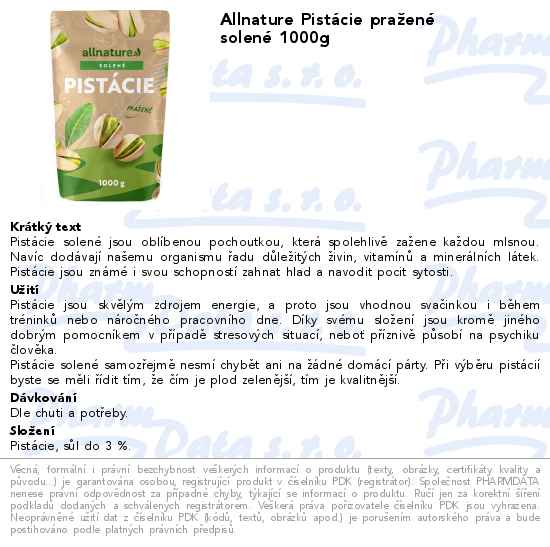 Allnature Pistácie pražené solené 1000g