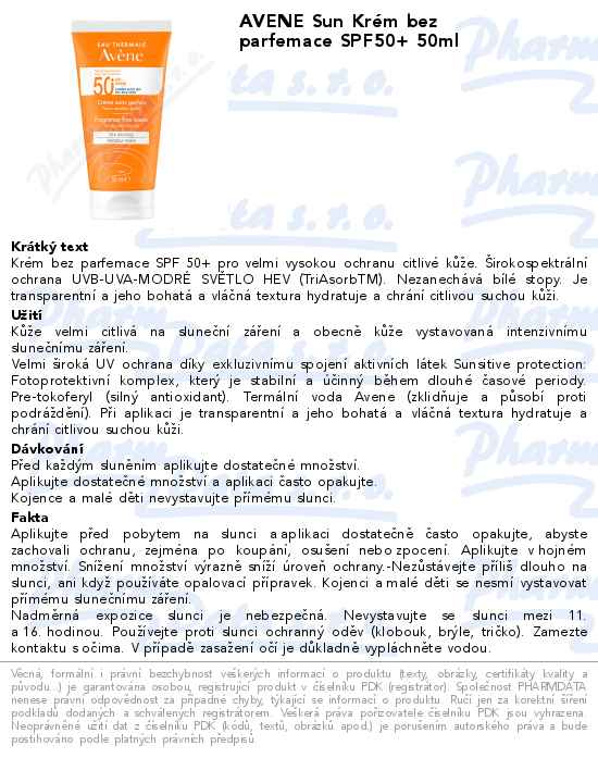 AVENE Sun Krém bez parfemace SPF50+ 50ml