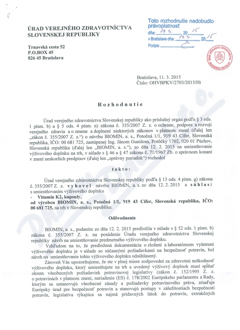 2 strany osvědčení hlavního hygienika: strana 1, strana 2,