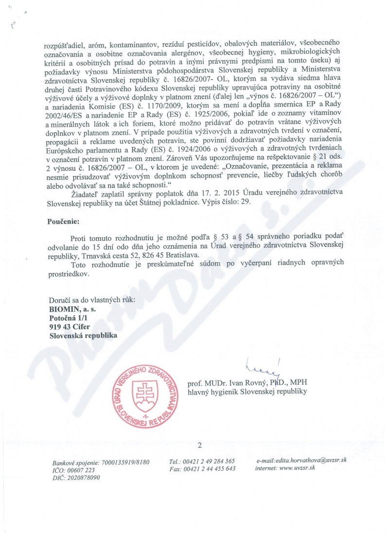 2 strany osvědčení hlavního hygienika: strana 1, strana 2,