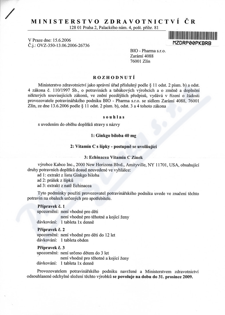 2 strany osvědčení hlavního hygienika: strana 1, strana 2,