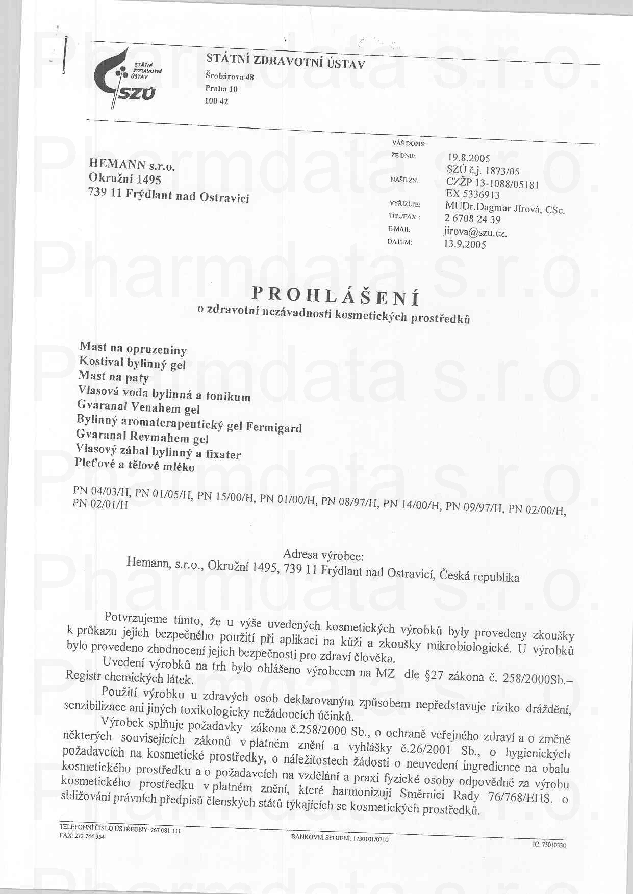 2 strany osvědčení hlavního hygienika: strana 1, strana 2,