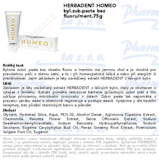 HERBADENT HOMEO byl.zub.pasta bez fluoru/ment.75g