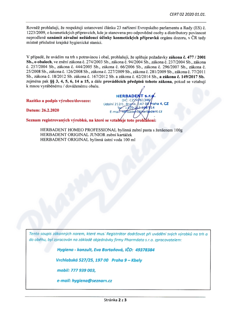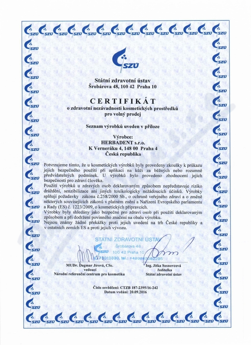2 strany osvědčení hlavního hygienika: strana 1, strana 2,