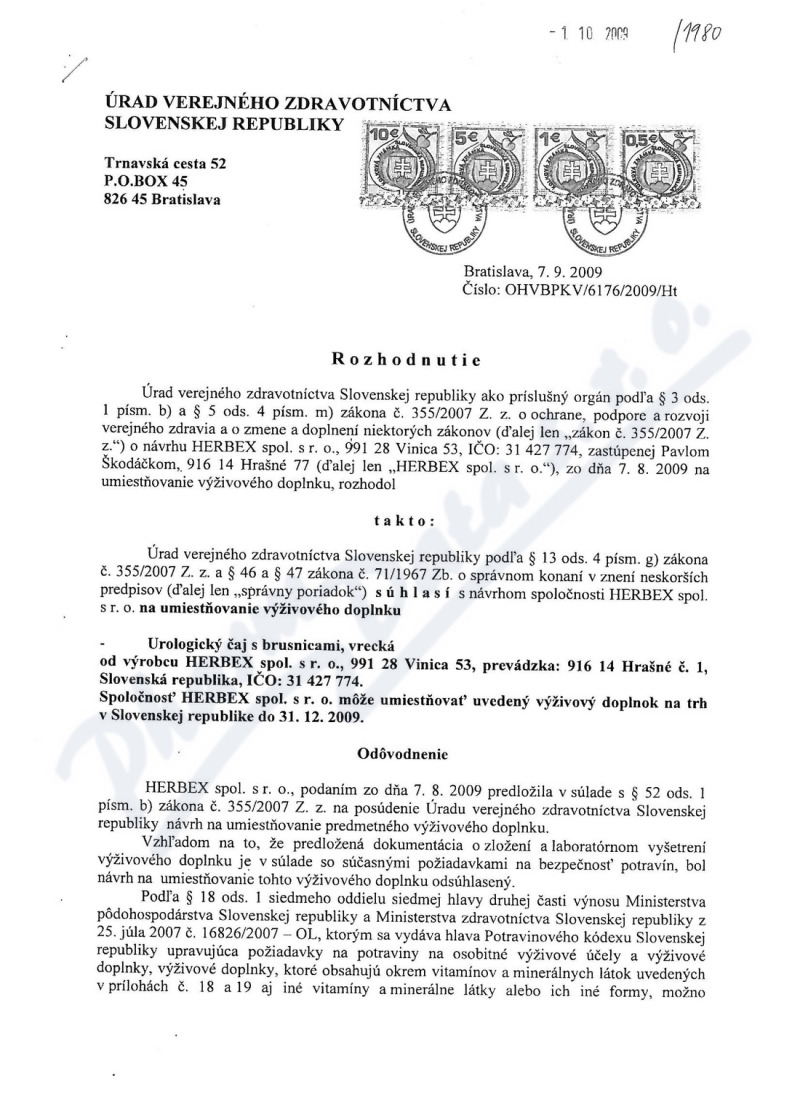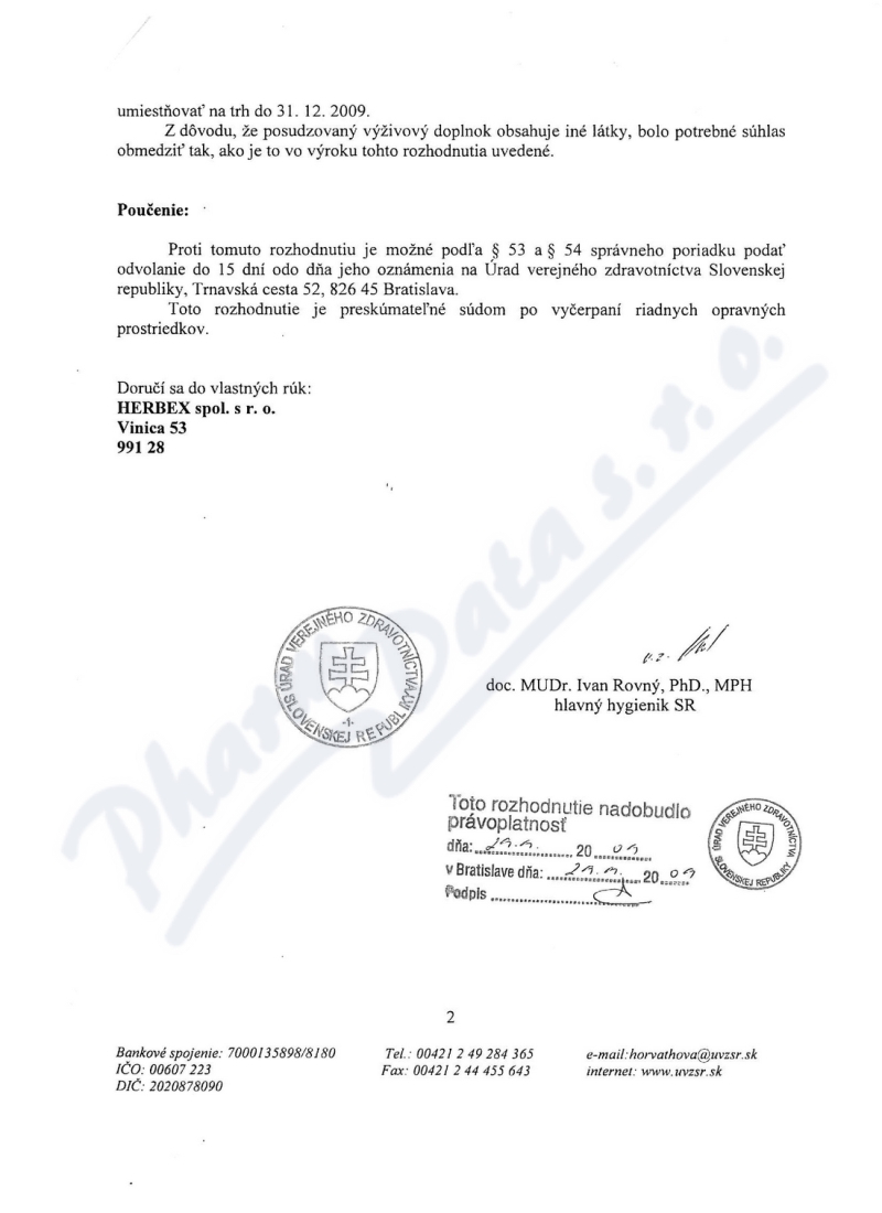2 strany osvědčení hlavního hygienika: strana 1, strana 2,