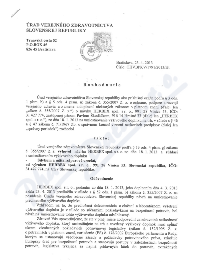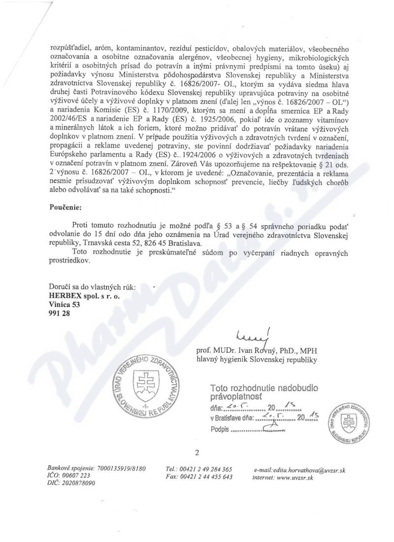 2 strany osvědčení hlavního hygienika: strana 1, strana 2,