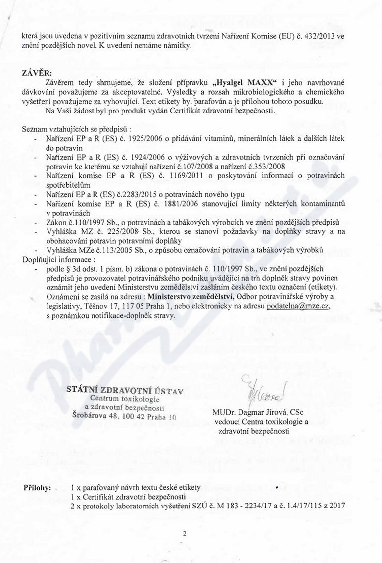 2 strany osvědčení hlavního hygienika: strana 1, strana 2,