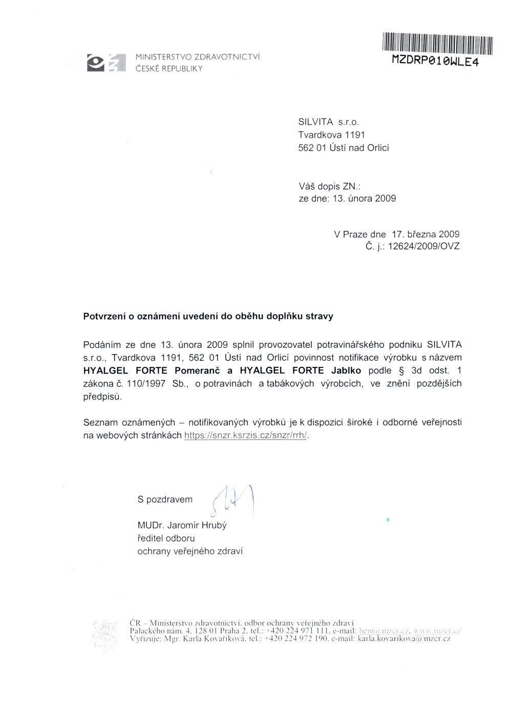 osvědčení hlavního hygienika