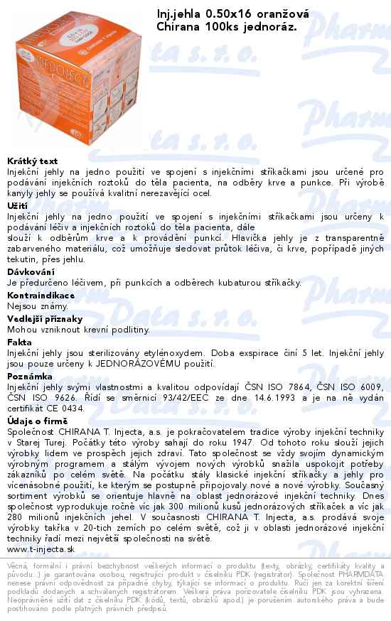 Inj.jehla 0.50x16 oranžová Chirana 100ks jednoráz.