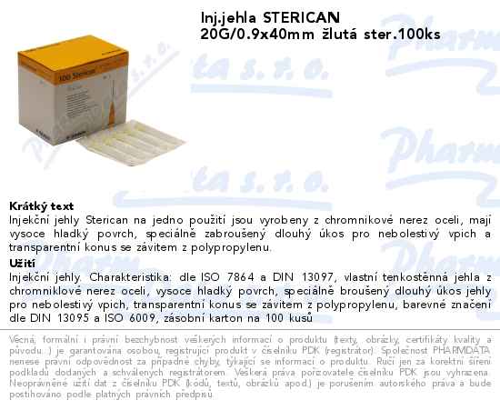 Inj.jehla STERICAN 20G/0.9x40mm žlutá ster.100ks
