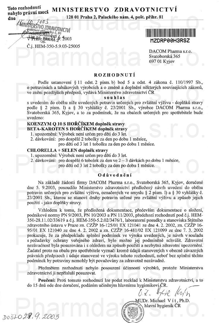 2 strany osvědčení hlavního hygienika: strana 1, strana 2,