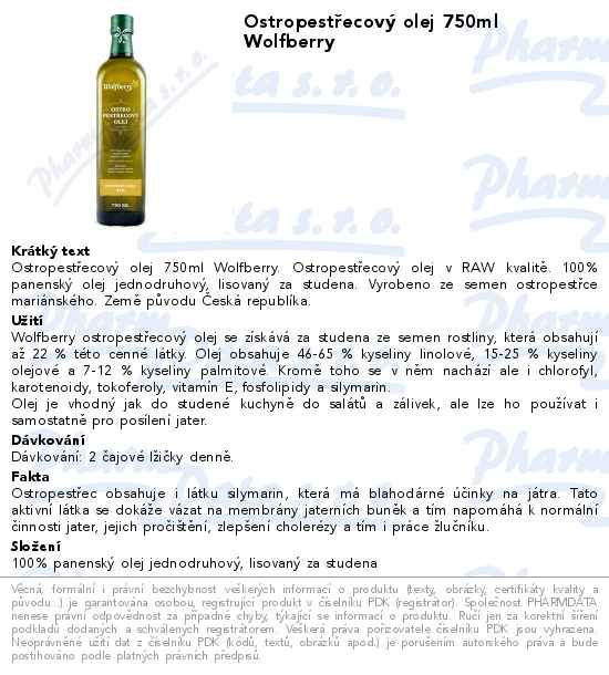 Ostropestřecový olej 750ml Wolfberry