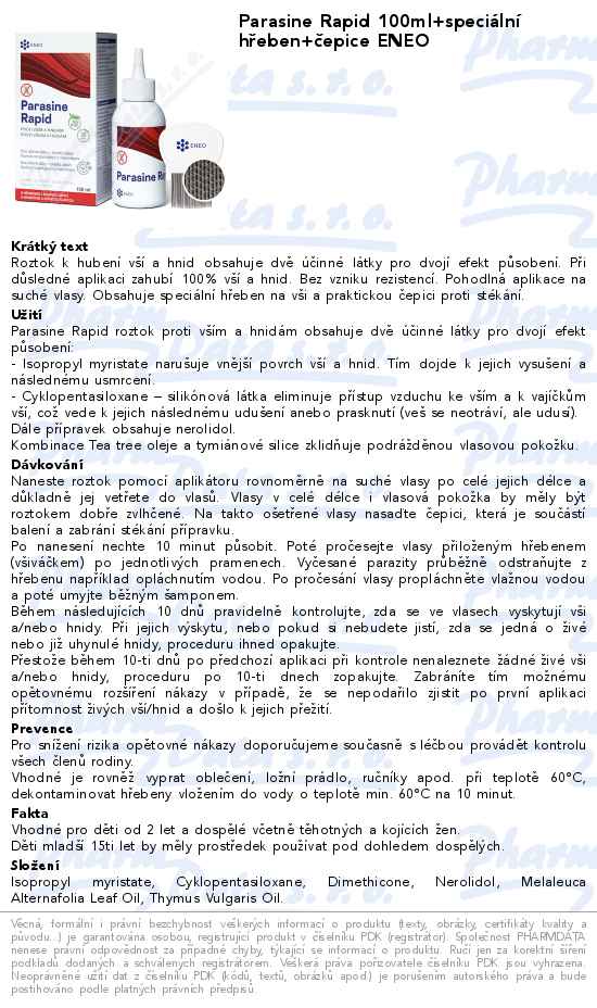 Parasine Rapid 100ml+speciální hřeben+čepice ENEO