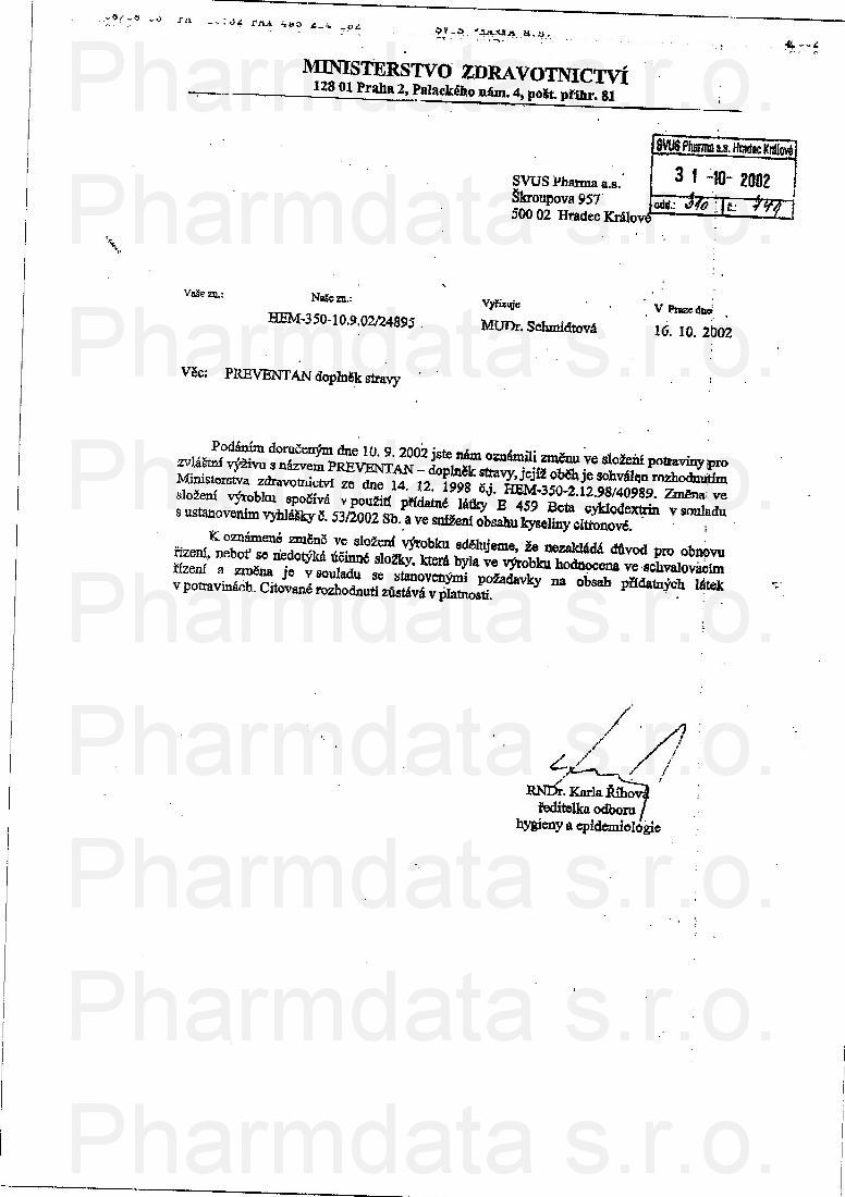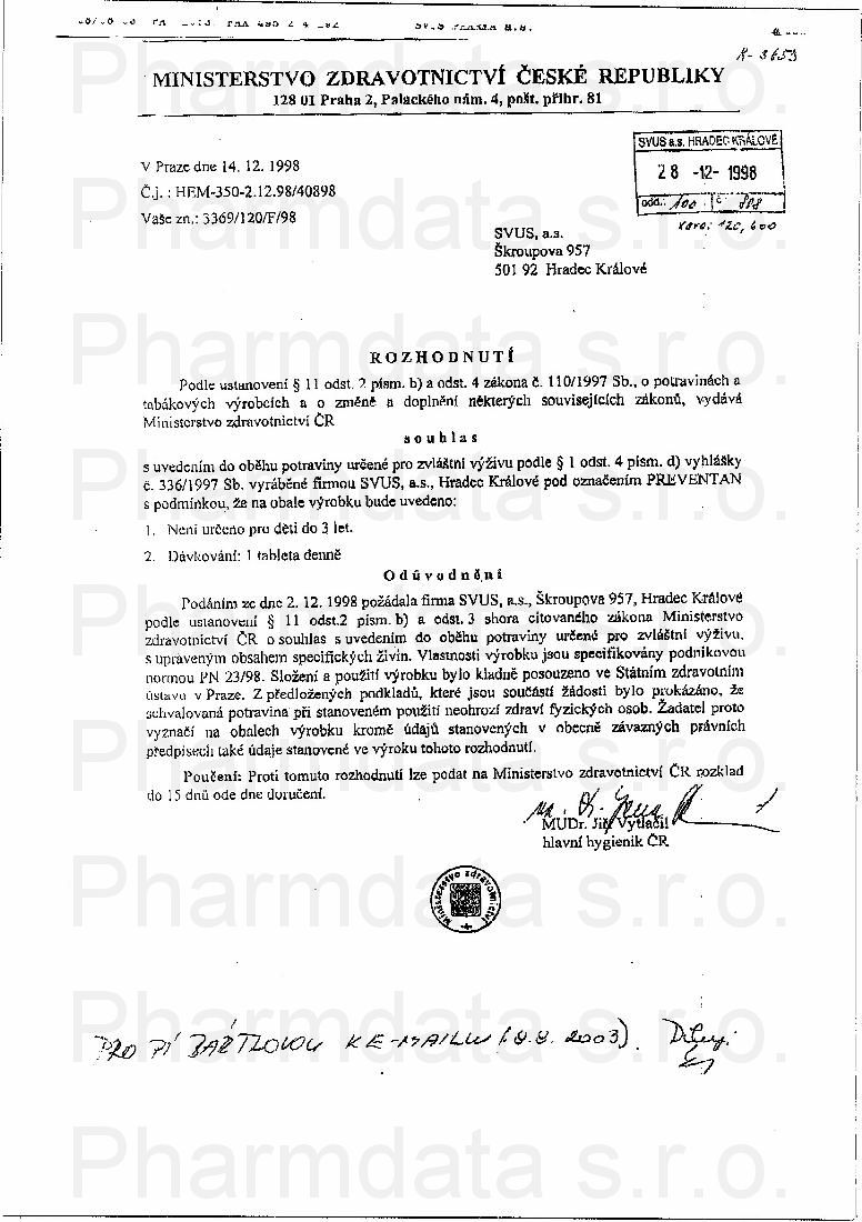 2 strany osvědčení hlavního hygienika: strana 1, strana 2,