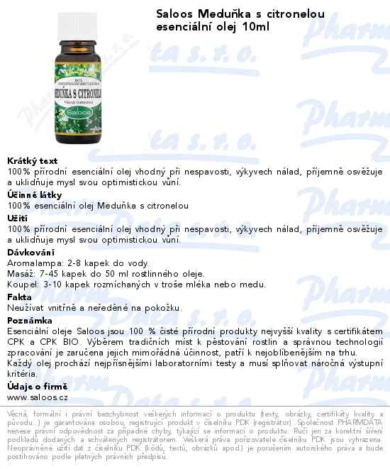 Saloos Meduňka s citronelou esenciální olej 10ml