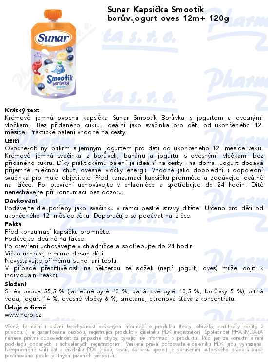Sunar Kapsička Smootík borův.jogurt oves 12m+ 120g