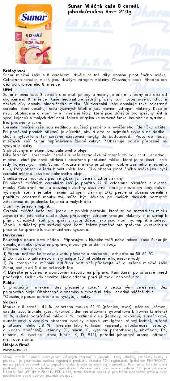 Sunar Mléčná kaše 8 cereál. jahoda/malina 8m+ 210g