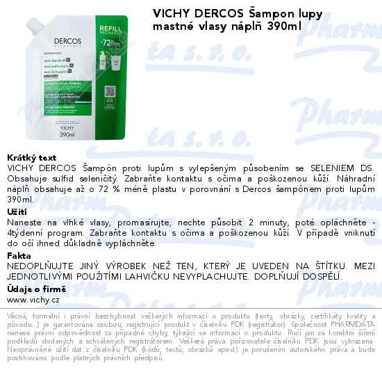 VICHY DERCOS Šampon lupy mastné vlasy náplň 390ml