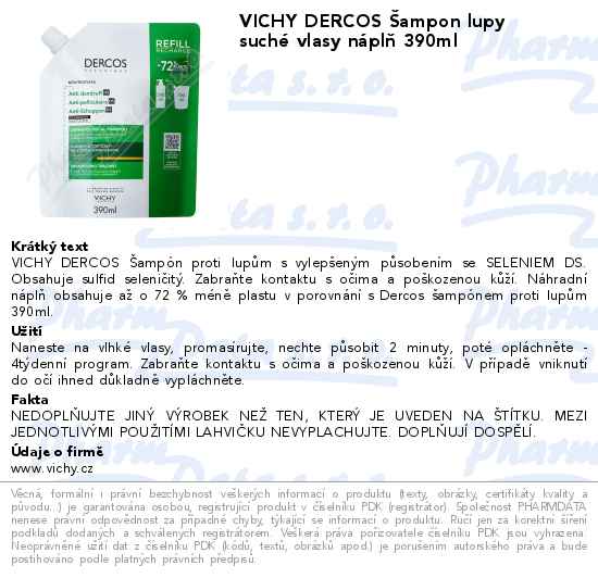 VICHY DERCOS Šampon lupy suché vlasy náplň 390ml
