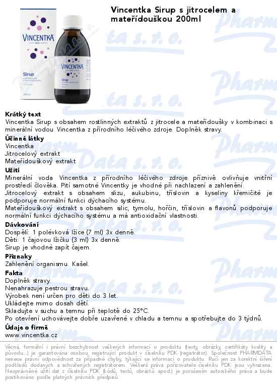 Vincentka Sirup s jitrocelem a mateřídouškou 200ml