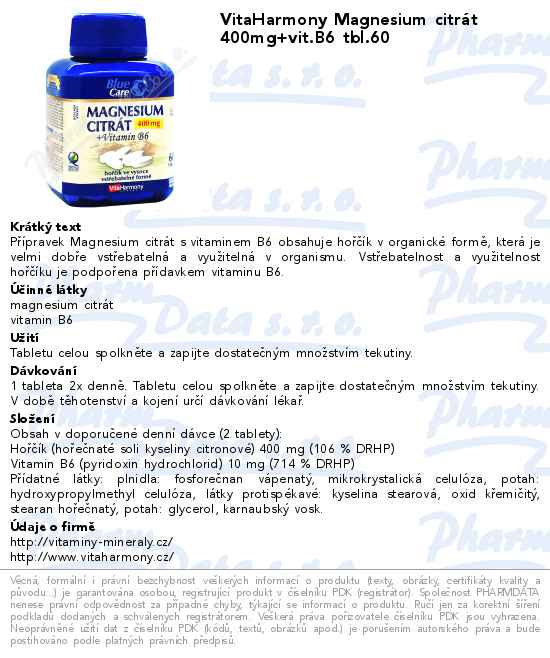VitaHarmony Magnesium citrát 400mg+vit.B6 tbl.60