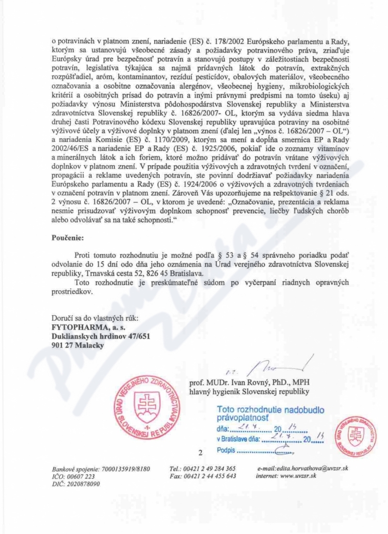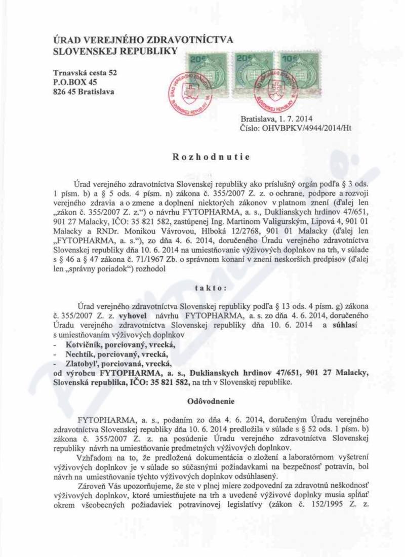 2 strany osvědčení hlavního hygienika: strana 1, strana 2,